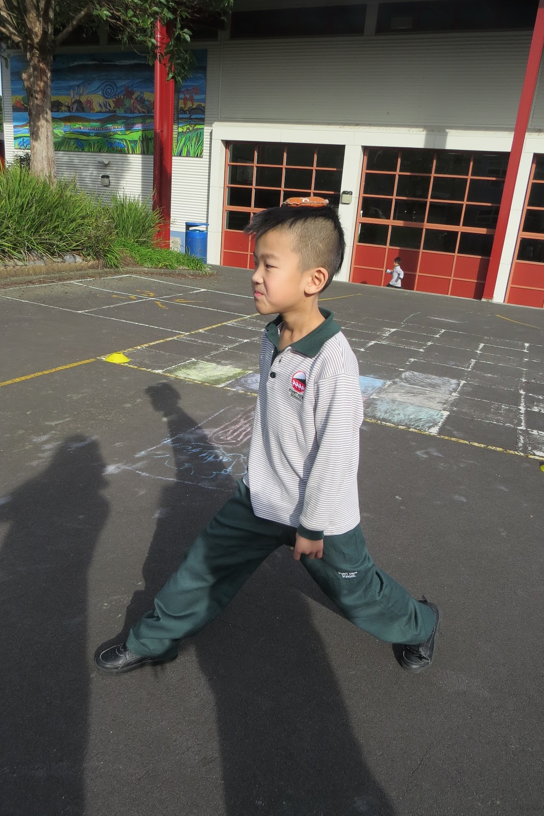 He focused on balancing and the students enjoyed range of activities to show how good they were at balancing. The students balanced soft toys on their head and walked around very carefully. Then they balanced the soft toys on their shoulder, hand, leg and other parts of their body and walked around on the concrete. If someone dropped a soft toy another student could pick up the soft toy and put it back on their head. They had to be so careful because they couldn't drop their soft toy. After that they played Paper, Scissors, Rock as a team.