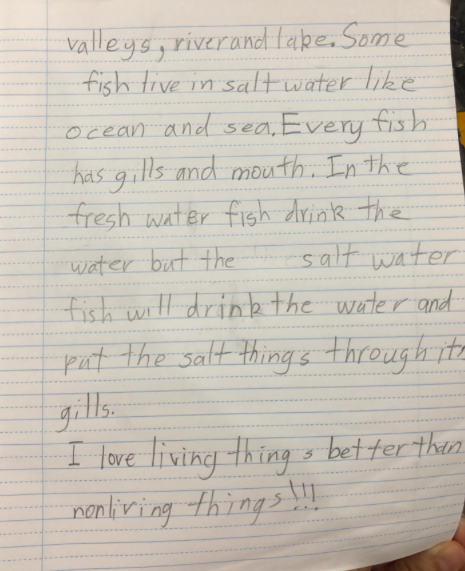 Angelina did some problem solving, addition and greater and less than. She also worked on her Chinese lessons. Angelina wrote about living and non-living things.