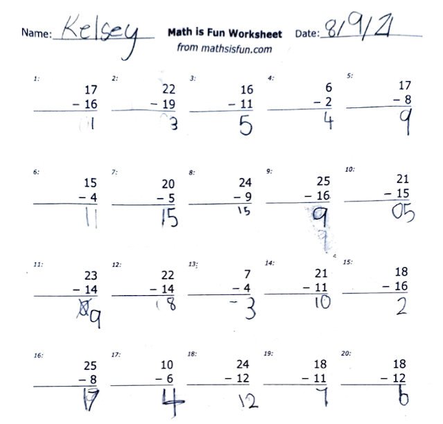 Kelsey wrote about what she did on Tuesday. She also did some addition.